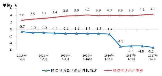 移动电话通话量持续下降。1-4月,全国移动电话去话通话时长完成8825亿分钟,同比下降5.2%;全国固定本地电话通话时长完成510.6亿分钟,同比下降19.3%。