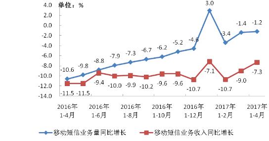 图7 2016-2017年4月移动短信业务量和收入同比增长情况
