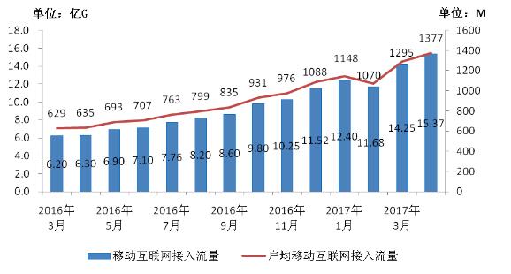 图8 2016-2017年4月当月移动互联网接入流量和户均流量比较