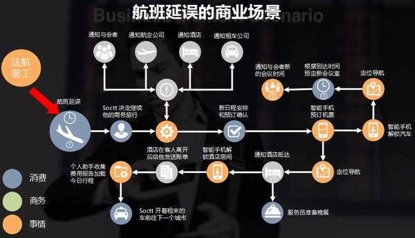 焦烈焱指出,通常的软件设计会以一个事件为中心,为各系统开发出监听程序,通过判断上下文信息而决定产生的动作。例如,针对航班延误这个事件,程序员要手动对机票改签、酒店改期、会议安排变更等建立连接。而普元的理念,是要将AI元素植入企业软件,使软件自动建立对各系统的联动关系,无需人为设置,让软件像多米诺骨牌一样发生连锁反应。