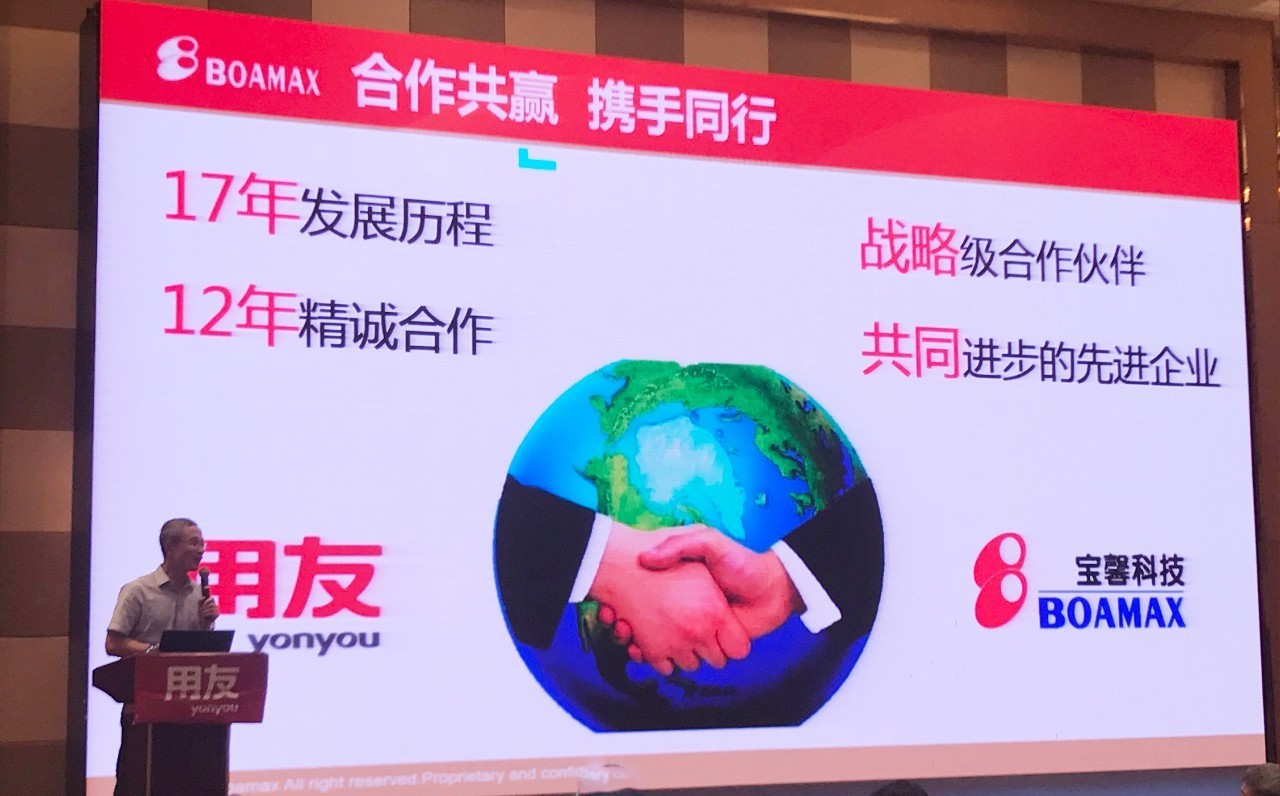 苏州宝馨科技实业股份有限公司创始于2001年,其研发、设计和生产的工业级数控钣金结构件产品一直和诸多世界知名企业保持着良好的合作关系。会上,宝馨科技总经理朱永福向与会嘉宾详细分享了宝馨信息互联与转型智能的战略历程。宝馨与用友精诚合作12年,通过构建统一的管理信息化平台、信息共享、加强管控,有效驱动宝馨集团化、多元化和国际化的战略实现与落地。