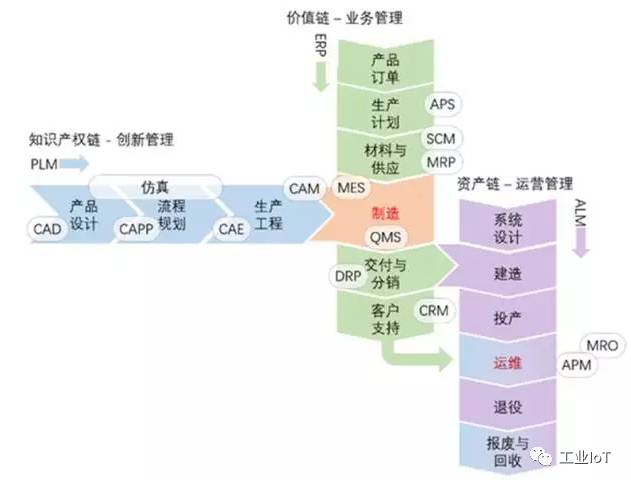 尽管不同的制造细分行业,同一细分行业不同的企业,这些流程会有差异,作为一个概括,可以把重要的流程分为三大链:第一链,垂直的,是以ERP为首的价值链;第二链,水平的,是以PLM为主的知识产权链;第三链,也是垂直的,是资产链。