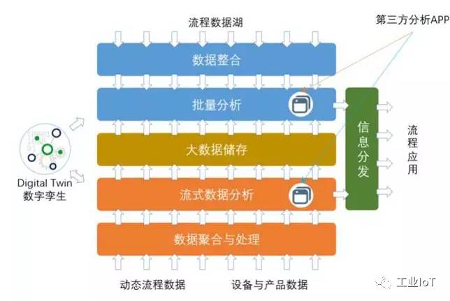 由于生产过程复杂,数据收集对象种类多(包括物料、产品、工具、设备、物料分拣传送系,人员、环境和安全传感器等),数量大,采样时间密度大、并需要作多参数同步关联性分析。因此,为了对生产过程作全面覆盖性的数据收集和分析服务,同时满足不同时效、可靠性、分析方法、计算强度和储存量的要求,需要有综合性的数据收集和分析平台。为了最佳地平衡这些需求,这个平台的功能的部署应是分布性的,把低时延可靠性高的流式数据分析部署在靠近生产现场的边缘端,也就是把分析功能部署在靠近数据源,靠近决策点;而把计算强度高和储存量大,但对时延和可靠性要求不太严格的批量分析部署在计算资源丰富的数据中心或云端。这样的一个分析平台还应能提供一个开放性的分析应用(APP)框架,使能特别是第三方数据分析专业人员简易快速地开发新的分析应用和增强现有分析应用的效能,以提高生产过程的应变能力。