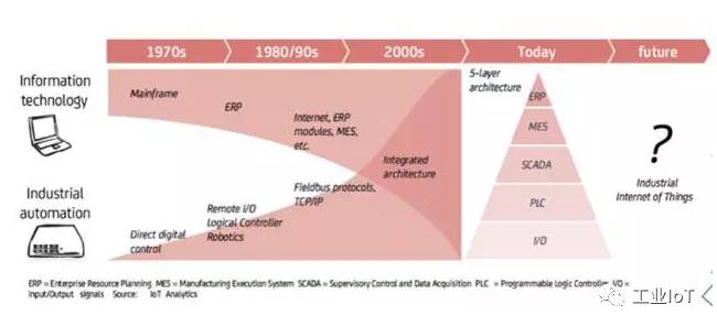 我们上面提到的工业数据分析的报告 ,也提供了很好的描述了信息技术在工业自动化这两个一开始完全分割的领域,在不同的时间段里相互靠近,最后融合在一起的过程。在过去的十多年里,被广泛接纳的ISA95垂直分层的五层自动化金字塔一直用于定义制造业的软件架构。在这个架构中,ERP系统处于顶层,MES系统紧接其下,SCADA系统处于中层,PLC和DCS系统置之其下,而实际的输入/输出信号在底部。这个报告并提出,IoT架构和相应的分析能力可能会改变这个架构图像。