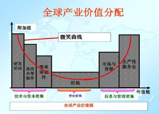 在2010年,中国的工业总产值就已达到全球的20%,一举超过美国,成为全球第一的制造业大国,日本第三,德国第四。在生产制造大国的背后,是以承接世界制造链转移和我国制造业整体水平不断提升的过程中逐渐形成的。资本家通过直接投资和股权安排、国际间的收购和兼并、代工生产等方式,把劳动密集型的生产组装环节转移到我国,而将技术与资本、信息与管理密集的研发、高技术零部件、市场营销等高附加值的活动留在本国完成。因此,我国所承接的这些产业链,大都是低附加值环节,整体呈现着大而不强的特点。