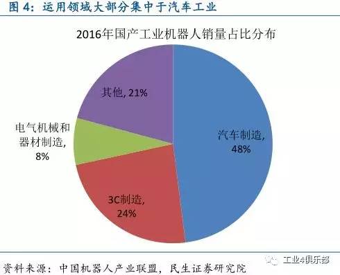 其中金属制造业行业和以家用电器制造、电子元器件、计算机和外部设备制造等为代表的电器机械和器材制造行业,在国产工业机器人销售总量中的占比最高,分别占31%和23%,汽车以外其它领域的系统集成正在迅速增加。