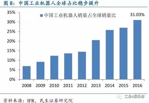 根据IFR初步统计数据,2016年我国工业机器人销量已高达9万台,较2015年增长31.28%,显著高于全球工业机器人14%的销量增速,其中中国工业机器人销量占全球销量比重以达31%,我国工业机器人的需求有了显著增长,成为全球的重要市场。