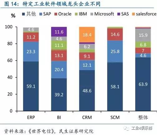 目前产业格局仍是欧美企业主导。从产业格局看,目前全球工业软件产业主要由欧美企业主导,呈“两极多强”态势,SAP、Siemens在多个领域均崭露头角,而IBM、达索系统和Salesforce.com在各自专业领域形成了一定优势。
