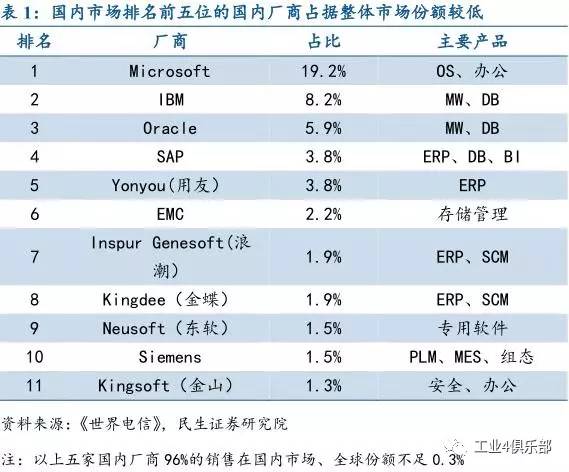 国内市场排名前五位的国内厂商占据整体市场份额较低,且其96%的销售在国内市场,全球份额不足0.3%。当前我国工业软件产品多集中于OA、CRM等门槛较低的软件类型,而国外产品在MES、ERP、PLM等主流工业软件市场上占据主导,稳定性与可用性均强于国内产品。