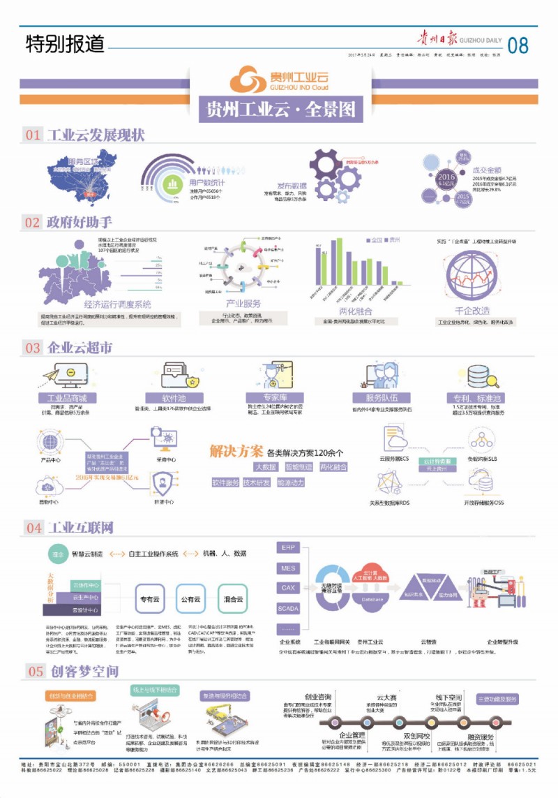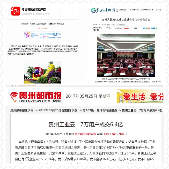 贵州工业云作为省经信委主办的贵州省重点应用示范项目的“7+N”朵云中最重要的一朵,是贵州省工业要素资源集聚、开放和共享,营造大众创业、万众创新的有效载体;是助推贵州工业企业发展和转型升级的重要支撑;是贵州省实体经济宏观管控、产业结构调控、政策与职能服务的主要抓手。目前贵州工业云平台已有7万企业用户,2016年共发布采购需求1286条,发布金额16.4亿元,成交6.4亿元;发布产品65条,成交1052笔,成交金额6.5亿元;发布企业需求433条,成交金额3亿元;发布企业能力84条,成交金额1.5亿元。