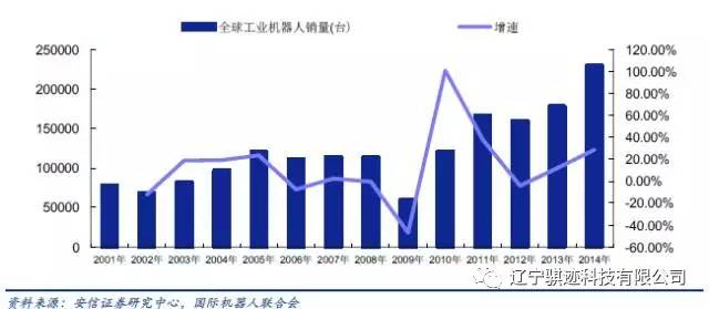 机器代人热潮使工业机器产业得到快速发展。工业机器人诞生于上世纪40年代的实验室里,20多年后才在日本开始产业化。 21 世纪以来,随着劳动力成本的不断提高,技术的不断进步,各国陆续进行制造业的转型与升级,出现了机器人替代人的热潮,工业机器人自动化装备备得到了快速发展。据国际机器人工业联合会统计, 2014年全球工业机器人销量达到22.92万台,同比增长28.7%。2008年至2014 年,工业机器人期间复合增长率达到30.7%,正处在快速发展期。工业机器人已广泛应用于汽车、电子电气、金属和机械等领域,在机器人替代人工生产是未来制造业重要的发展趋势,是实现智能制造的基础,是未来实现工业自动化、数字化、智能化的保障。
