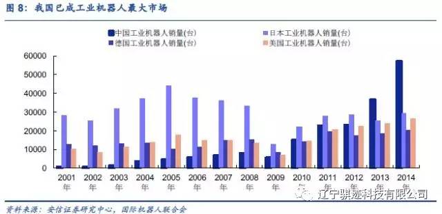 对比工业发达的日本、德国和美国,我国工业机器人需求增速的走向与他们大致相同,但增速一直较高。在2013年以前,日本一直是全球最大的工业机器人市场,但自2011年以来日本工业机器人的增速较为平缓。2013年,我国工业机器人销量一举成为全球最高, 2014年我国工业机器人销量达到57096台,同比增长56.7%,销量第一的市场位置继续保持。