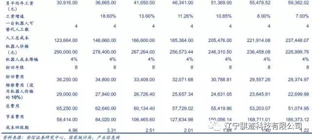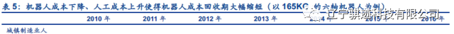 从机器人的成本回收期看,会。根据国家统计局的数据,我国制造业城镇单位就业人员的年平均工资从2010年都 30916万元增长到2014年的51369万元,年均增速达到13%。根据中国产业信息网的资料,工业机器人的成本逐年递减4%。以165KG 的六轴机器人为例,其回收周期将由2010年4.96年下降到2016年1.22年。随着人力成本的上升、老龄化的加剧,我国数量庞大、低成本劳动力优势在逐渐丧失,基础性工作招人越来越难。工业机器人成本的下降,机器人的投资回收期还将进一步缩短,将有助于机器人逐步实现劳动力替代。