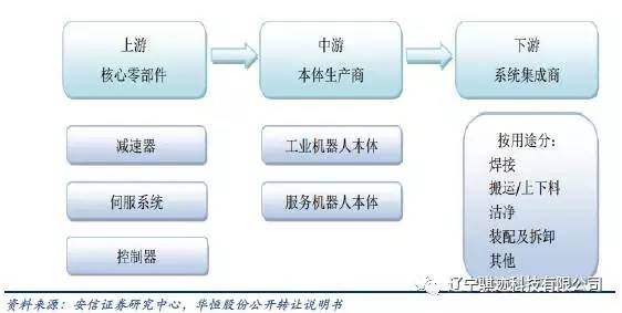 机器人自动化行业按产业链分为上游、中游和下游。上游生产核心零部件:包括减速器、伺服系统、控制器;中游是本体生产商,包括工业机器人本体、服务机器人本体。下游是系统集成商,包括单项系统集成商、综合系统集成商。