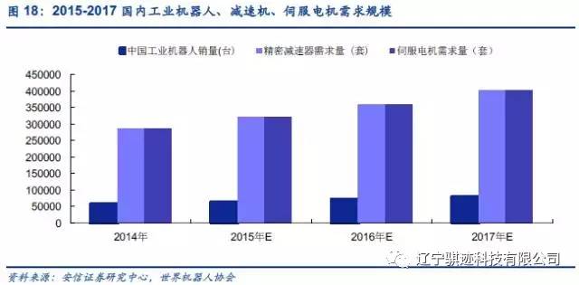 国内减速器、伺服电机市场需求广阔。一般而言,一套工业机器人的一个手臂需要配备一个减速器和伺服电机,那一套工业机器人需要配备4-6个减速器/伺服电机和1套控制系统。根据世界机器人协会的预测, 2015-2017年我国工业机器人销量将保持12%的年增长率,分别达到6.395万台、7.162万台和8.022万台。假设平均一台工业机器人平均配备5个减速器/伺服电机,工业机器人精密减速器/伺服电机的2015-2017年的需求量将达到31.98万套、35.8万套和40.1万套。