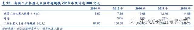 2014年我国工业机器人本体市场规模84亿,预计2018 年机器人本体市场规模为300 亿,还有2.7倍的空间。根据世界机器人协会的最新数据和《中国制造 2025》工业机器人技术路线图,预计我国机器人市场未来 4 年复合增速约为 30%,若以 20万元/台的测算,则 2018 年我国机器人本体市场规模为 300亿,是2014年的 2.67 倍。
