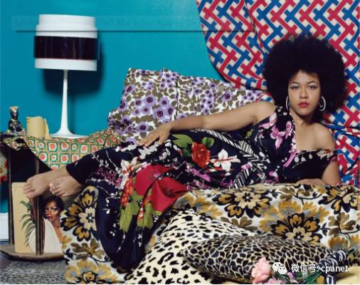 米卡琳·托马斯(Mickalene Thomas)是近年来成名的非洲裔美国艺术家之一,她深受非洲艺术、印象派以及波普艺术等流派的影响,利用绘画和摄影等媒介创作。本次展销会展出她的一幅近作,仍然保持她的一贯风格。该作品中有一位非洲裔女子非常自信地斜躺在沙发上,与观众对视,如同印象派马奈《奥林匹亚》画作中的女子。但她的作品背景和周围充满了兽皮、植物和几何图案,色彩十分艳丽。
