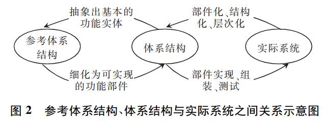 参考体系结构中的功能实体细化为可以实现的功能部件,同时细化功能部件之间的交互方式,就可以构成体系结构。而将体系结构中的功能部件及其交互方式实现、组装、测试之后,就可以构成实际系统。而从实际系统、体系结构、到参考体系结构的过程,属于逆向工程的过程,主要用于系统的故障检测、维护、以及功能扩展。