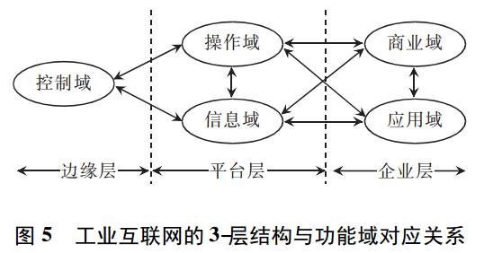边缘层从工业控制系统收集数据,传送给平台层;从平台层接收对于工业控制系统的控制命令。平台层从企业层接收、处理、并且向边缘层转发控制命令;从边缘层汇聚、处理、并且向企业层转发数据。企业层实现特定领域的应用、决策支持系统,并且向端用户提供应用接口。图5是3-层体系结构模式与功能域的关系示意图。
