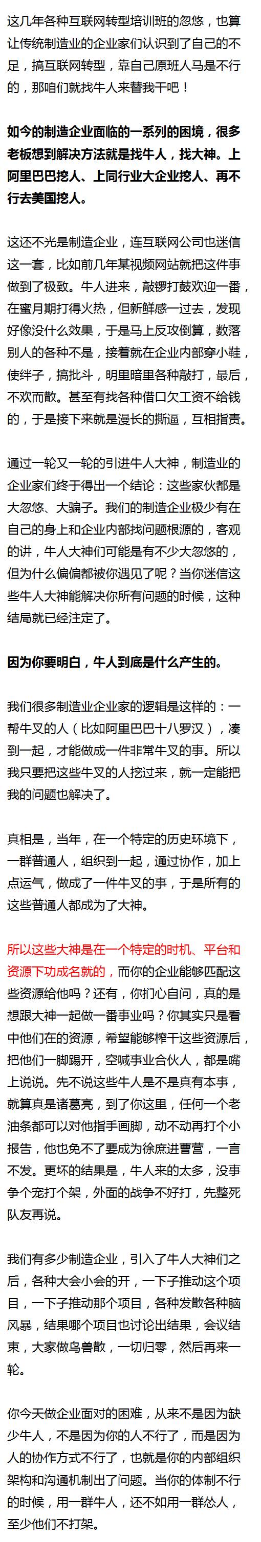 中国的传统制造企业总是在两个极端上来回摆动,当土豪们听了某位大师的互联网思维讲座,热血沸腾的时候,一拍脑袋可以豪掷千金,我就见过一个做钢管的公司,给员工连个口罩都不舍得买,却扔几千万去开发APP互联网平台的。而这些“跨越式”发展的企业,一旦遇到挫折,又立刻缩回来,变得比任何人都保守,你跟他说什么他都认为你是忽悠、扯淡、不切实际。然后开始怨天尤人,跟政府抱怨给员工上社保太贵啦、环保检查太严啦之类的,高呼“实业难做”,企图让政府出手救他。