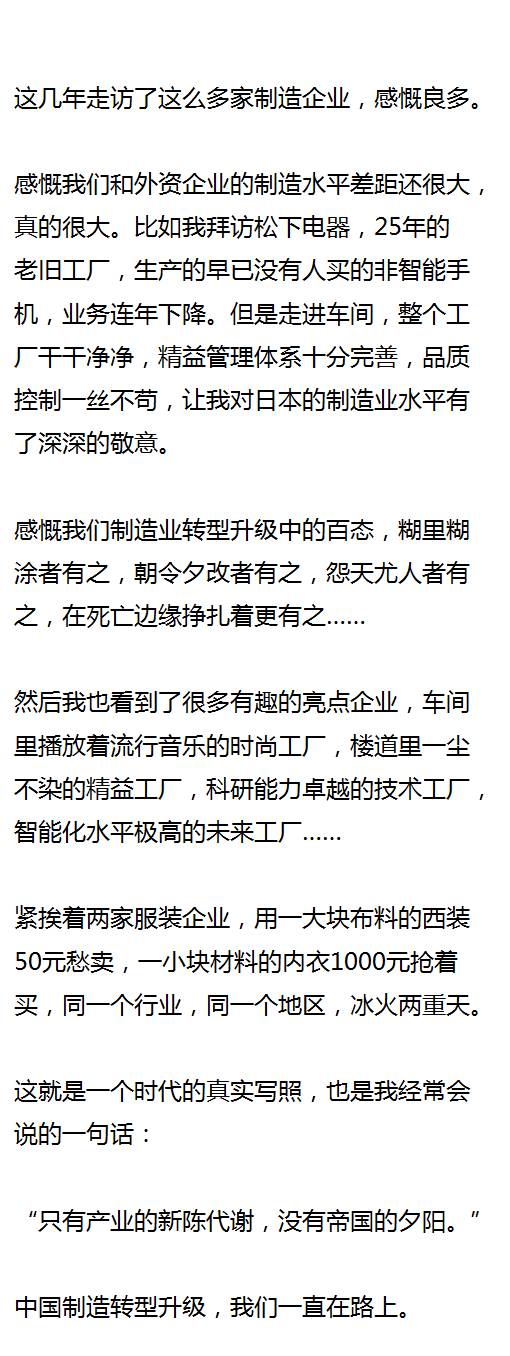 走得多,见得多,感慨也不少,尤其是这几年制造企业日子不好过,大家纷纷动起了“转型升级”的脑筋,成功的有那么一些,但更多的是把自己玩死的。
