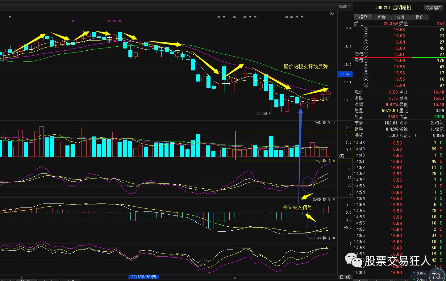 老魏在,3月2日提示,这股票已经回踩了下方智能辅助线支撑成功,并且主力资金仍然有关注,并且量能持续地流入,捕捞季节再次发出金叉买入信号,股价强势已经确立,相信把握住了,都会有不错的收益。