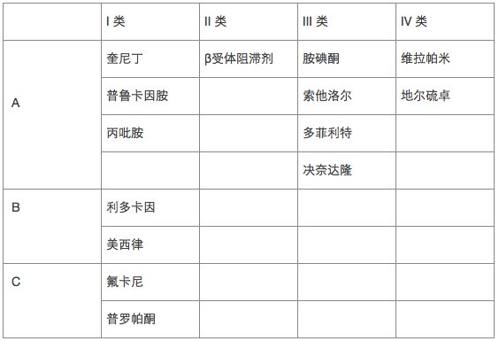 I 类药物:膜抑制剂,主要降低心肌细胞中 Na+的通透性。根据对动作电位过程作用分为 A,B 和 C 类。IA 类药物可以延长动作电位时程,IB 类药物缩短动作电位时程而 IC 类药物几乎不影响动作电位时程。