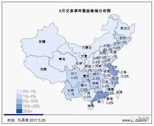 截止本周五下午,投资、上市和并购共77起事件,涉及总金额133.54亿元人民币。从交易金额来看,涉及金额较大的事件是2017年5月23日,芜湖顺荣三七互娱网络科技股份有限公司成功受让樟树市网众投资管理中心(有限合伙)、杨东迈、谌维持有的上海墨鹍数码科技有限公司68.43%股权,作价11.1亿人民币。从交易事件地域分布看,目前主要分布在北京市、广东省和上海市,占比分别为23.38%,14.93%和13.80%。本周新三板市场共有31家企业挂牌,新增加股本为17.86亿股,本周新三板成交总金额为51.70亿元人民币,目前共有11240家企业挂牌新三板,总股本为6489.87亿股。