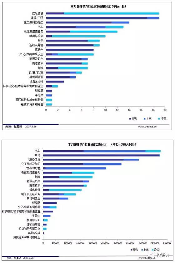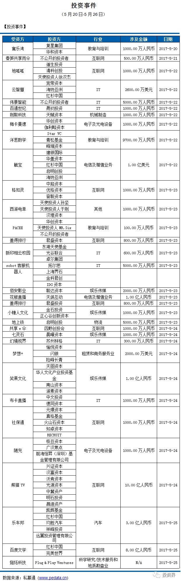 截止本周五下午,共发生33起投资事件,披露投资金额事件32起,共计37.33亿元人民币。本周涉及金额较大的投资事件发生在互联网行业,2017年5月24日,兴证创新资本管理有限公司、汉富(北京)资本管理有限公司、上海沃肯资产管理有限公司、上海光挚源投资管理有限公司、上海中冀资产管理有限公司等投资上海熊猫互娱文化有限公司10亿人民币。熊猫TV成立于2015年7月,创始人及CEO为王思聪,直播平台于2015年10月21日正式上线,主打游戏直播。完成融资之后,熊猫直播会通过自身的节目制作能力、产业链上下游资源整合能力为用户提供更丰富的内容。资金将主要用于建立完备的内容体系,和拓展团队。平台将继续保持游戏和电竞领域的优势,加紧拓展娱乐、综艺、户外、体育等多种泛娱乐直播内容,并与其他内容厂商一起合作探索直播类PGC的创新方向。