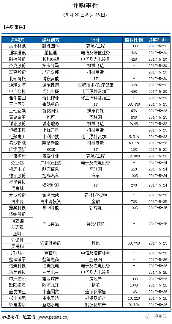 截止本周五下午,本周并购市场共发生36起并购事件,交易金额为73.25亿元人民币。从并购事件交易数量来看,本周机械制造行业发生5起并购事件,本周并购金额较大的并购事件是:2017年5月23日,芜湖顺荣三七互娱网络科技股份有限公司成功受让樟树市网众投资管理中心(有限合伙)、杨东迈、谌维持有的上海墨鹍数码科技有限公司68.43%股权,作价11.1亿人民币。