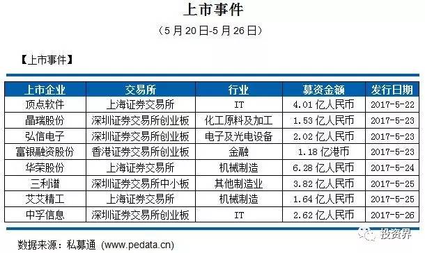 截止本周五下午,本周共有8家企业上市,总融资金额22.96亿元人民币。本周融资金额较大的上市事件为:2017年5月24日,华荣科技股份有限公司在上海证券交易所上市,发行股数8277万股,每股发行价格为7.59元人民币,共募集资金金额6.28亿元人民币。公司成立于2010年12月,是国内领先的防爆电器、专业照明设备供应商,其产品广泛应用于石油、化工、煤矿、天然气等存在易燃易爆气体的危险作业环境,以及公安、消防、部队、港口、场馆等需要专业照明设备的领域。登陆沪市只是一个新的开始,充分利用资本市场,未来在中国专业照明领域,华荣股份的表现值得业界继续期待。
