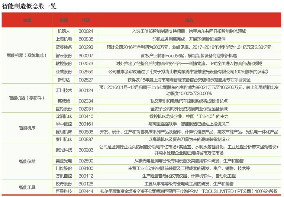 2016年12月7日,国家工信部正式公布《中国智能制造“十三五”规划》(以下简称《规划》),为中国制造业智能化转型的重要五年确定两大时间节点和十个重要任务。此次政策红利为智能制造行业注入“强心剂”,能够推动机器人与自动化、智能物流装备等相关智能装备产业概念股中长期受益。