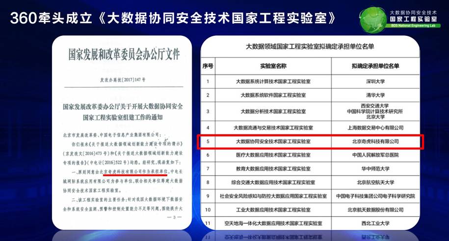 5月26日,由国家发改委批准成立的大数据协同安全技术国家工程实验室(以下简称“实验室”)在数博会上正式揭牌。该实验室由360公司领头承建,中国工程院院士邬江兴出任实验室技术委员会主席,并联合长城网际、国家互联网应急中心、国家信息中心、中国信息安全测评中心、公安部三所、中国信息通信研究院、复旦大学、北京中测安华科技有限公司等单位共同建设。