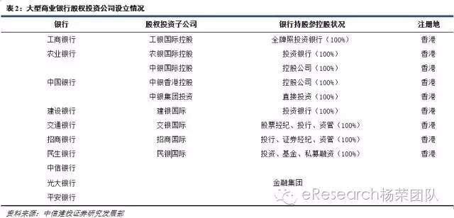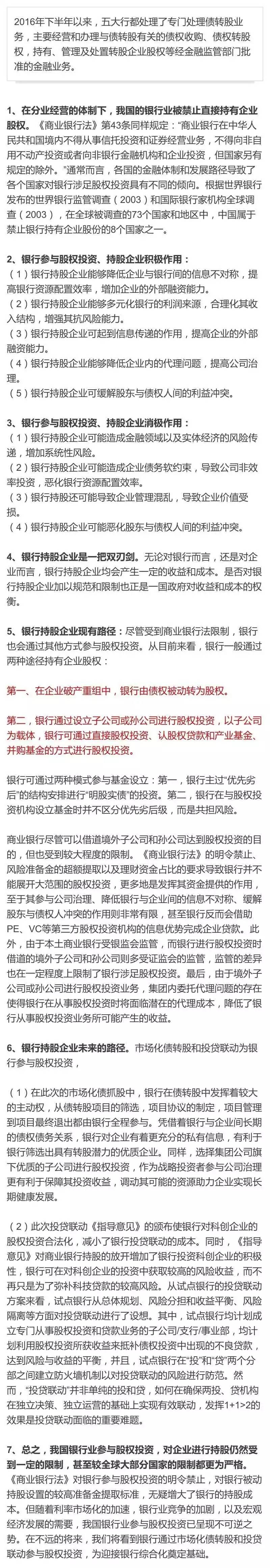 今年以来,市场化债转股开始被提上日程。8月初银监会就《关于钢铁煤炭行业化解过剩产能金融债权债务处置的若干意见》向各银监局、各政策性银行、大型银行及股份制银行,以及金融资产管理公司征求意见,10月10日,国务院便发布了《关于市场化银行债转股的指导意见》,除了明确债转股的对象、实施机构、债权定价以及退出机制外,还明确指出银行不得直接参与债转股,但银行可通过向实施机构转让债权、由实施机构将债权转为对象企业股权的方式实现。为银行通过内地子公司参与股权投资扫清了道路。