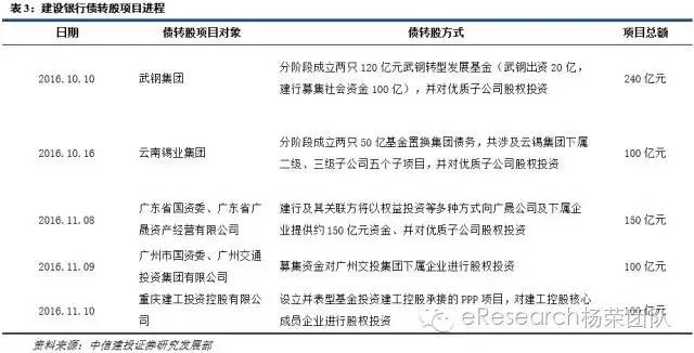 《指导意见》颁布之后,各大商业银行加速了债转股的工作进展。其中,建设银行走在了债转股的前列。目前,建行已先后完成了全国首单地方国企云锡集团、全国首单央企武钢集团市场化债转股项目、广东省内首单省属国有企业广晟公司市场化债转股项目和广州交通投资集团的债转股项目。