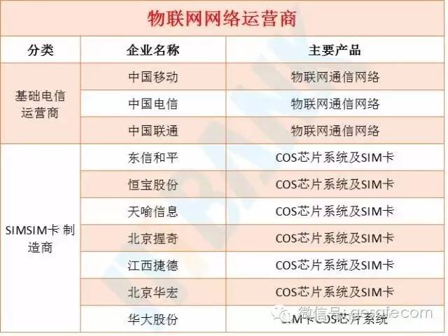 考虑到物联网很大程度上可以复用现有的电信运营商络(有线宽带网、2/3/4G移动网络等),同时国内基础电信运营商具有垄断特征,是目前国内物联网发展的最重要推动者,因此我们在这个环节将聚焦三大电信运营商和与之紧密相关、且会受益与之紧密相关、且会受益与之紧密相关、且会受益与之紧密相关、且会受益蜂窝物联网终端增长的SIM卡制造商身上,如东信和平、恒宝股份、天喻信息等。