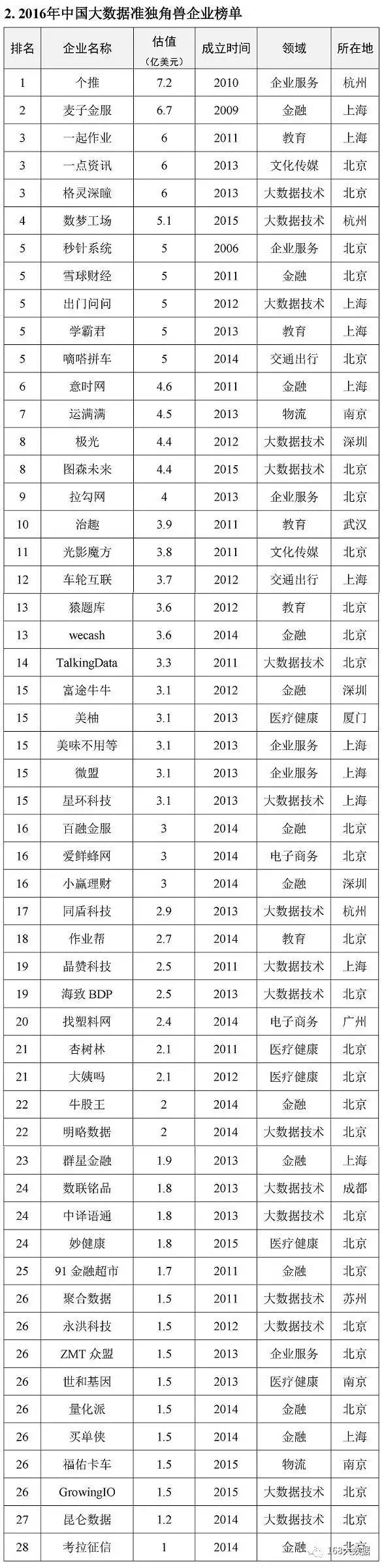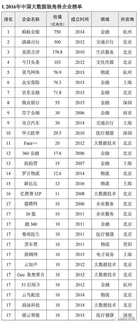 (上图为2016大数据独角兽名单,北京市长城企业战略研究所制表)
