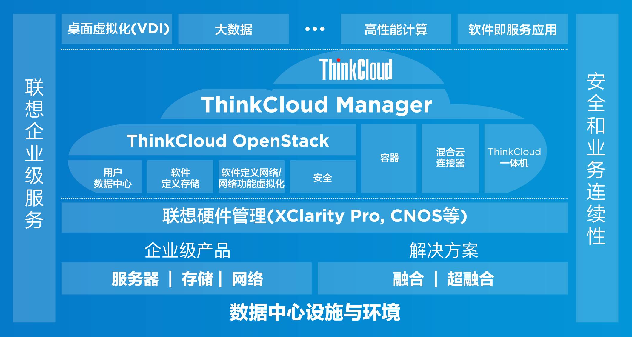 技术能力为本,助力客户业务持续创新为帮助客户更好的应对业务的双态性,联想成立了数据中心集团,助力中国企业的数字化转型。在产品和方案领域,联想拥有一系列有竞争力的稳态产品包括存储、网络、服务器产品线。同时,联想还打造了一系列有竞争力的敏态产品。比如:XClearfy服务器CNOS网络管理平台、ThinkCloud云管理平台以及VDI/大数据/高性能计算等平台解决方案。