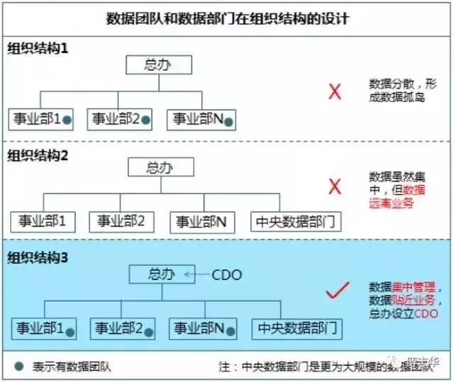 我们认为较为合理的数据团队在组织架构应该这样设立(如图中的组织架构3):首先,设立公司级的中央数据部门,集中存储和管理数据;其次是每个事业部(或业务部门)设立数据团队;第三是在总办设立CDO的岗位。这样的好处在于数据能够集中管理,数据贴近业务,可以很好的发挥数据的价值;同时,在总办(高管团队)设立CDO岗位,可以让数据更好的为决策层服务,数据分析所发现的商业价值也可以更快的应用于业务战略调整。