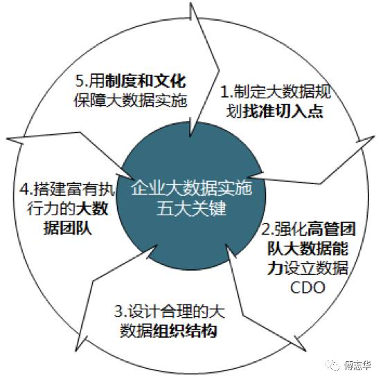 那么,在大数据时代,企业如何更有效的实施大数据战略,如何规划、如何实施、如何保障大数据的相关工作可以顺利开展。我们认为,企业要实时大数据战略,需要从五大关键方面规划:1.制定大数据规划找准切入点;2.强化大数据领导力设立CDO;3.设计合理的大数据组织结构;4.搭建富有执行力的大数据团队;5.用制度和文化保障大数据实施。本文将从这五方面展开。