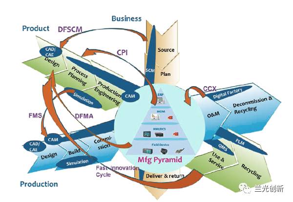作为潜心研究十多年MES的兰光创新认为,除了在平台化、云计算、移动互联等计算机技术进行拓展应用以外,作为MES方案的提供者,我们更应该站在制造业使用者的角度,以中国制造2025为宗旨,以精益生产为主线,以两化深度融合为突破口,参考德国工业4.0等先进理念,结合企业实际情况,建设基于工业3.0,面向工业4.0、体现CPS特点的智能MES系统,构建“生产精益化+设备自动化+管理信息化+人员高效化”的“新四化”智能车间,为制造企业智能化转型升级奠定坚实的基础。
