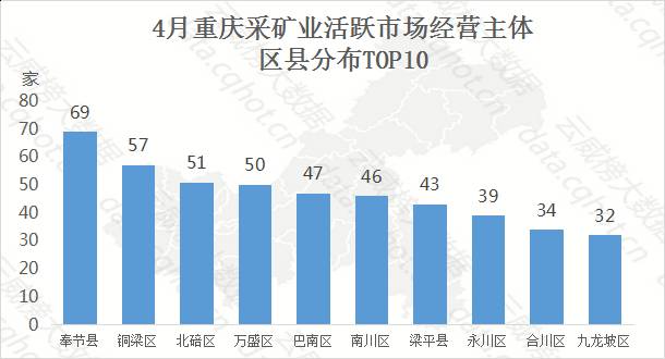3. 重庆采矿业活跃市场经营主体单位“云威榜-重庆互联网大数据分析中心”监测到,截止4月底,重庆采矿业共有活跃市场经营主体企业数1081家,其中奉节县、铜梁区及北碚区居于前三位。