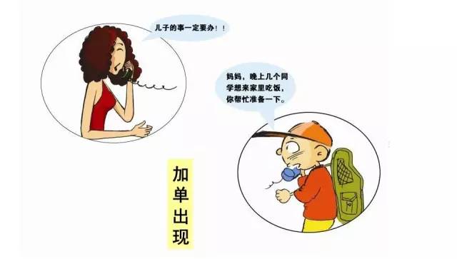 下午4点,电话铃又响:“妈妈,晚上几个同学想来家里吃饭,你帮忙准备一下。”(紧急插单)