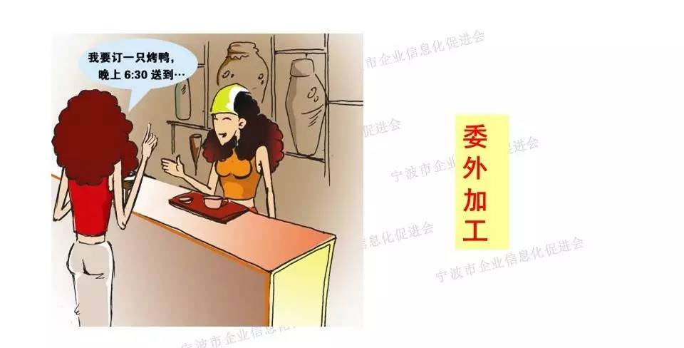 妻子发现拔鸭毛的夹子坏了,知道儿子放学早,然后通知儿子回来带个夹子来(生产异常,短信通知),没办法只能临时用手拔(生产作业更改),但很费时间,用微波炉自己做烤鸭可能就来不及(产能不足),于是决定在楼下的餐厅里买现成的(产品托外)。如果忙不过来请邻居帮忙,共同完成工作(生产计划临时调整为委外)。