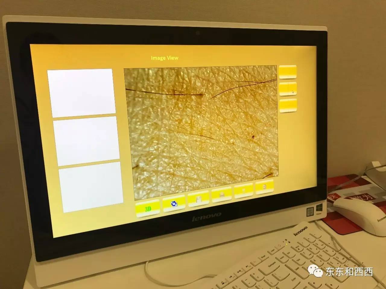 填好问卷,我们就被技师领去皮肤分析室做皮肤分析,了解皮肤及毛发状况。这是用放大分析仪照不同位置的表皮,能看到每一缕纹路和最细微的毛囊状态↓↓