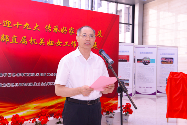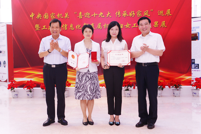 2017年9月11日,中央国家机关“喜迎十九大 传承好家风”巡展暨工业和信息化部直属机关妇女工作成果展在部西单办公区开幕。中央国家机关工委副书记、工会联合会主席陈存根,工业和信息化部党组书记、部长苗圩出席开幕活动,为“全国五一劳动奖章”和“全国最美家庭”获得者颁奖,为部直属机关“女干部之家”揭牌并参观了展览。部党组成员、中央纪委驻部纪检组组长郭开朗代表部党组作开幕致辞。