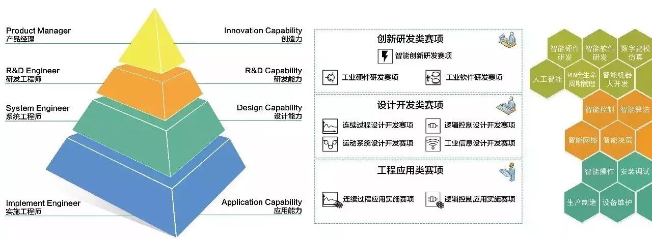 作为大赛的创始人、组委会秘书处张贝克教授认为,智能制造大环境下,我们最需要两类人才——产品经理和应用工程师。这张图最能说明大赛赛项设置和对这两类人才的关注: