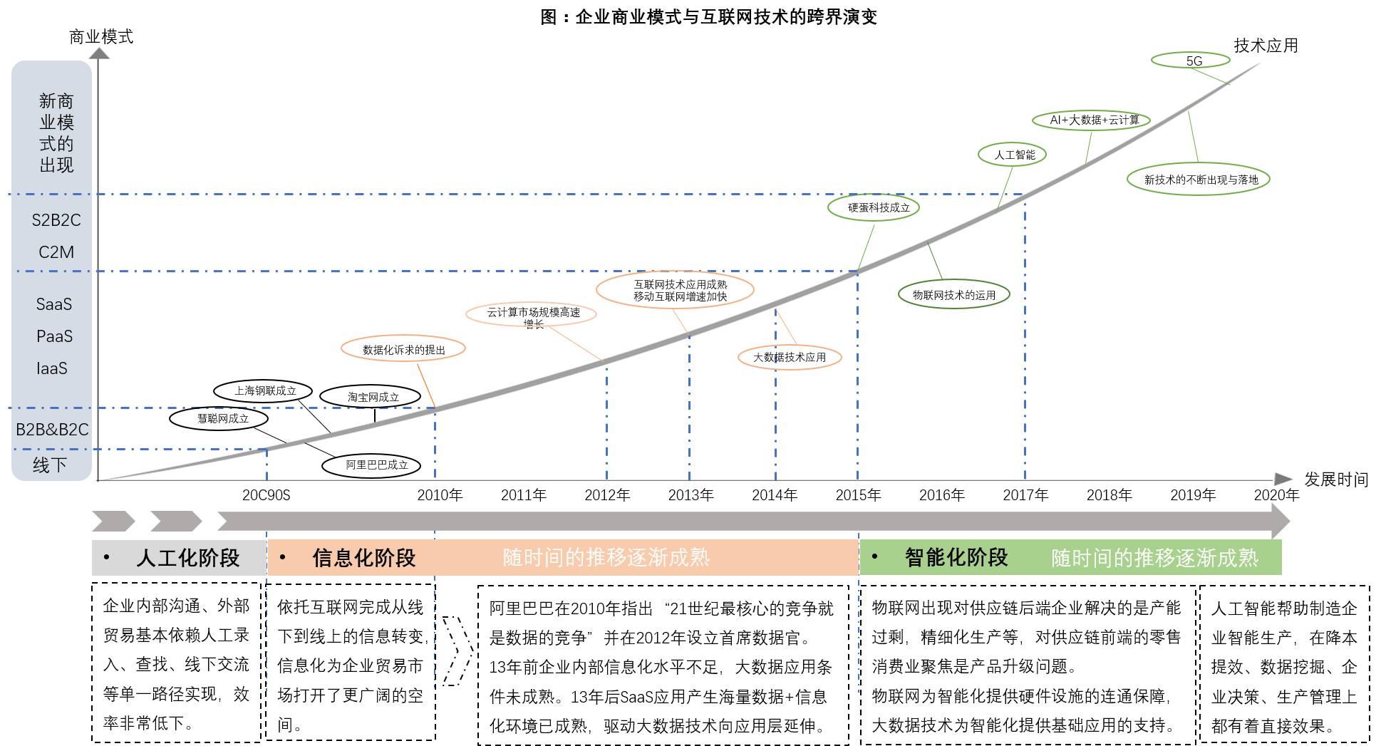 人工化阶段对应的是上世纪90年代之前,互联网和商业的交叉在国内基本上处于零状态,当时企业无论是内部沟通、外部贸易基本上全依赖人工录入、查找、线下交流等单一路径完成,效率是非常低下。后来在本世纪初的前十年,以阿里巴巴、慧聪网以及一些垂直型行业的网站上线,引导了一批中国中小企业开始规模性利用互联网去寻找贸易信息。当时基于互联网技术进行贸易信息的搜寻形式就形成了中国电子商务的雏形,与企业有关的是B2B、B2C两种。在这个阶段中小企业,完成了从线下到线上互联信息的拓展,为贸易市场打开了广阔的商业空间,我们也称之为信息化阶段的开始。后来经过2013年前后中国互联网普及率、移动互联网的使用率以及云计算市场的高速发展,一些基于新商业模式SaaS、PaaS、IaaS等新的企业开始出现,中国企业级服务市场在2015年后也进入了一个快速发展时期。