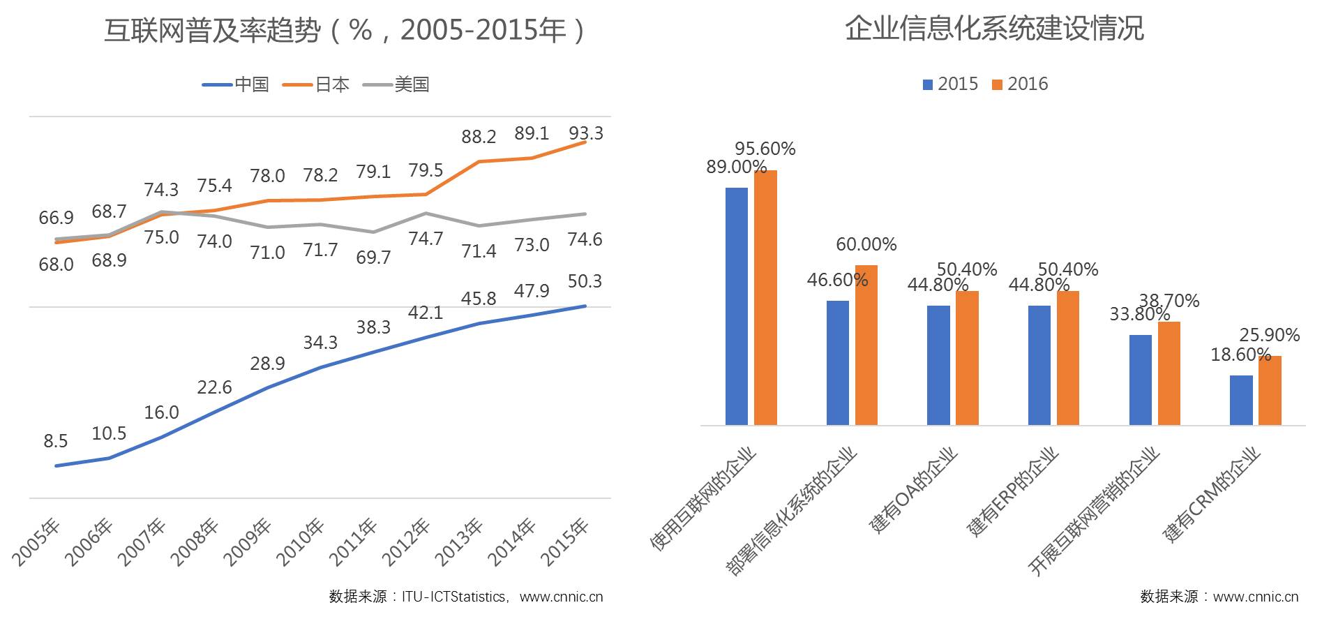 从图中可以看到,虽然中国互联网的普及率超过50%,但与美国、日本相比还有巨大的上升空间,与此同时,在企业互联网使用率高达95%的情况下,企业信息化建设情况还需进一步加强。这种高成长空间也给予了我国企业在跨界互联网上的很多想象空间。而且我们也认为,基于互联网技术的深度应用,中国中小企业的商业模式会发生全新的变化,中国企业能发生跨越式发展。这一点从现有的企业商业模式与互联网技术发展路径的相互对照中能窥见一二。