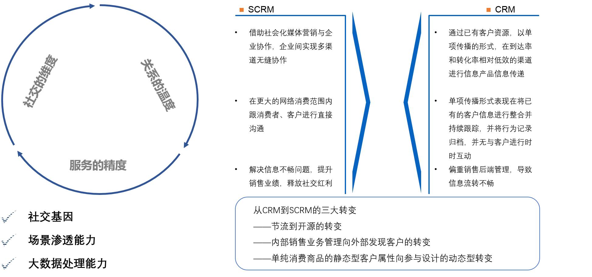 与CRM不同的是,SCRM更加侧重售前的客户挖掘和售中、售后的双向互动,在客户开源上去进行精准营销。这幅图展示的是一家专门提供SCRM的企业——腾讯企点,2016年6月上线,作为腾讯在企业级市场上的布局带着其强大的社交基因、精准化数据处理能力和强渗透性的场景能力,带来了一种全新的客户关系管理变革。在这种商业模式下,实现了企业与消费者的全程参与互动的社交关系闭环,真正去赋能企业实现“沟通”与“打通”。
